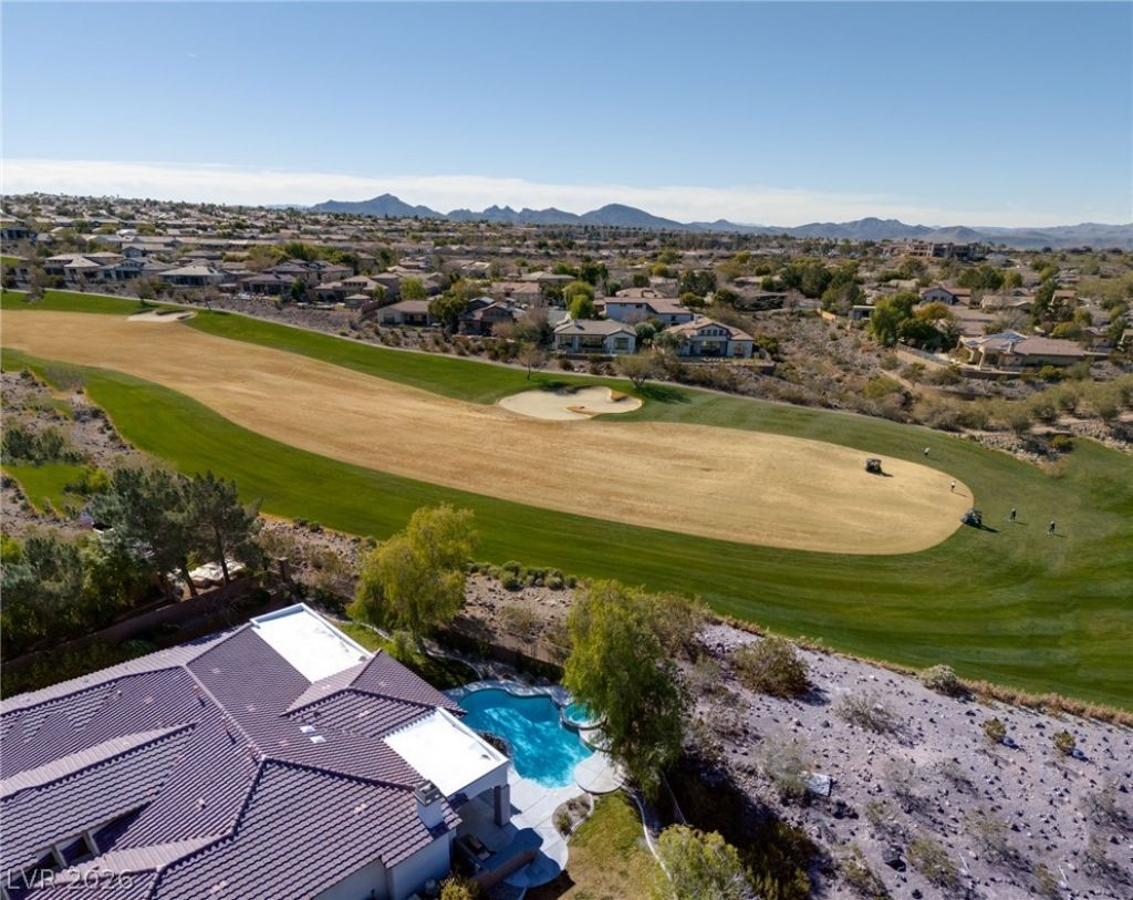 Located in the highly sought-after Anthem Country Club, this stunning single-story Aria model offers approximately 4,000 sq ft of fully renovated living space. Set on an exceptional .49-acre corner lot with no rear neighbors, this golf course frontage property captures incredible mountain views and breathtaking sunsets. The home features 4 bedrooms plus a den with wet bar, 2.5 bathrooms, and a rare 4-car garage. European-style wide-plank wood-look porcelain tile flooring runs t/o the main living areas, blending organic texture with modern durability. The contemporary island kitchen showcases quartzite countertops, stainless steel appliances, breakfast bar, and breakfast nook. New skylights in the kitchen and primary bath flood the home with natural light. Extensive upgrades include new AC units, new pool heater and pump, contemporary bathroom finishes, and a newly refinished roof?offering luxury, privacy, and resort-style living in one of Henderson's premier guard-gated communities.