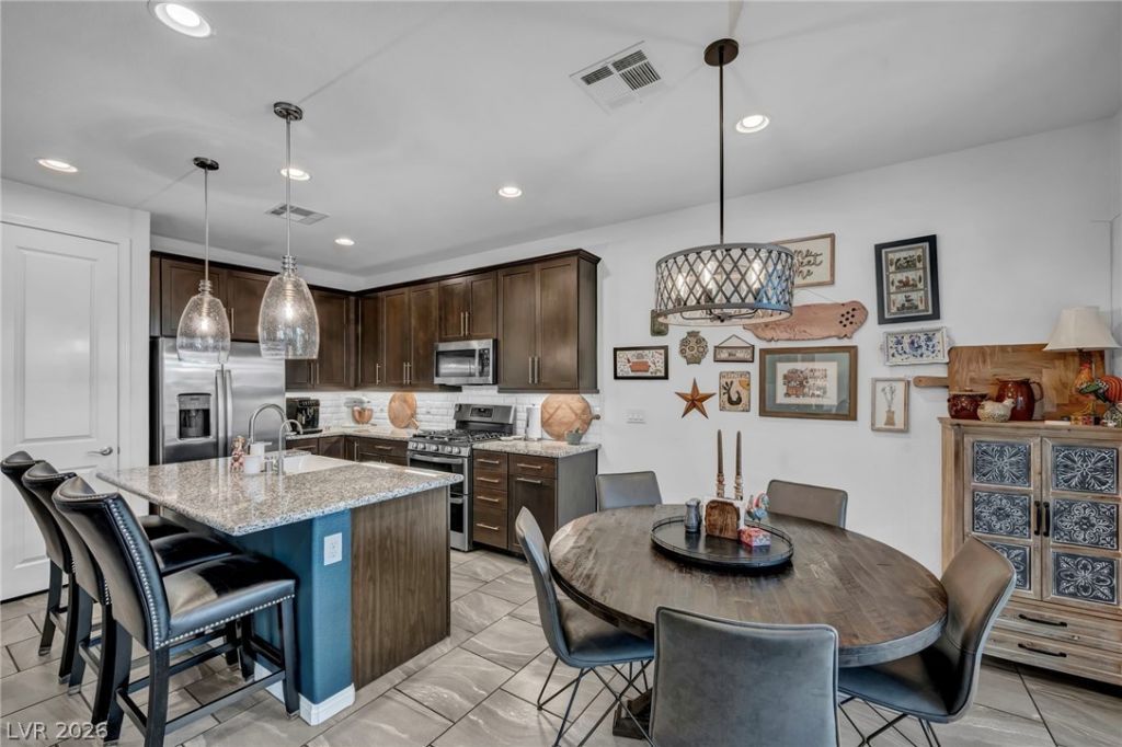 Turnkey home with thoughtful upgrades and a functional floor plan throughout. Tile flooring runs through the main living areas, with a multi-panel slider opening to the backyard. The living room features a modern gas fireplace and motorized shades on select windows and doors. The kitchen offers under-cabinet lighting, an apron-front sink, double ovens, and a convection microwave. The backyard is designed for low maintenance with a covered patio, extended shade, turf, seating area, and gated side access with keypad entry. The primary suite includes a large walk-in shower, custom closet, and mountain views. Secondary bedroom also features upgraded closet space. Upstairs includes a versatile loft and laundry room with cabinets. Additional highlights include epoxy garage floors, tankless water heater, water softener, and a separate storage room.