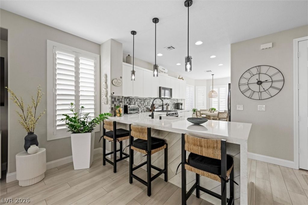 Beautifully updated single-story home in the highly desirable age-restricted community of Siena in Summerlin. This rare find offers an open floor plan filled with natural light and a perfect blend of comfort, style, and modern upgrades. The home has been thoughtfully renovated with custom cabinetry, luxury vinyl plank flooring, updated baseboards, modern lighting, ceiling fans, quartz countertops, brushed-nickel hardware, shutters, glass-and-aluminum shower enclosures, fresh paint, updated plumbing, and a new water heater. The kitchen features black stainless GE Profile appliances, white custom cabinets with sleek black hardware, pull-outs, and a Lazy Susan for added functionality. The backyard landscaping has been refreshed and includes an iron fence with mesh for added privacy. Enjoy Siena's guard-gated community with clubhouse amenities, social events, and activities designed for an active lifestyle. Truly turn-key ? nothing to do but move in and start enjoying your new home.