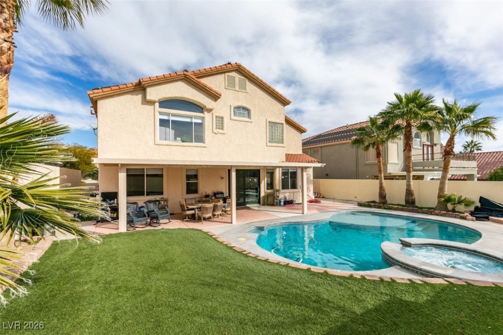 Priced to sell in Summerlin! Located in the coveted Cantabria community within The Trails, this rare opportunity features 4 bedrooms, soaring 19-ft ceilings, and a dramatic circular staircase at the entryway. The home offers formal living and dining rooms, a family room with fireplace, and a deep plunge pool. Spacious primary suite includes a spa-like features and custom walk-in closet with cedar finishes. 3-car garage, homes rarely available in this neighborhood so this won't last!