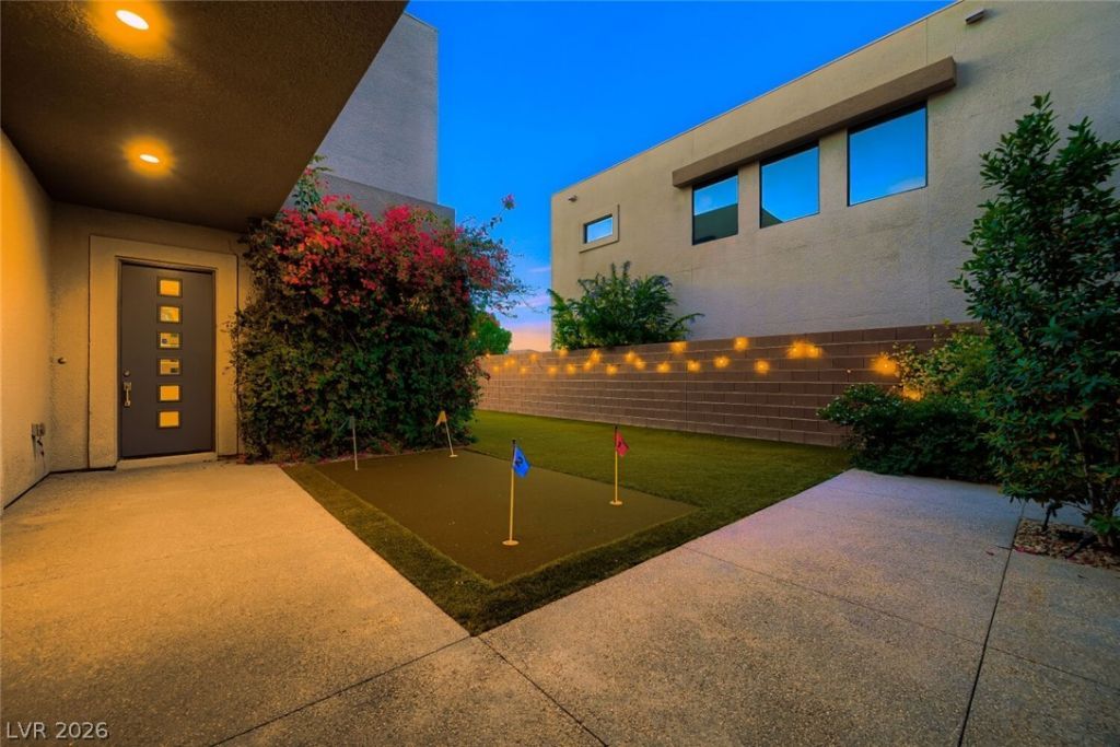 Welcome to an exceptional 3,396 sq ft luxury residence in gated Oluna. Offering paid-for solar, 4 bedrooms and 3.5 baths with refined modern design, the home includes an attached casita and a beautifully enclosed courtyard with putting green, ideal for elevated indoor-outdoor living. Fresh floor-to-ceiling paint, including the garage, creates a crisp, turnkey feel. The chef's kitchen features an oversized refrigerator and ice maker, complemented by an oversized laundry room with sink and ample cabinetry. The three-car garage is equipped with 220V for EV charging. An amazing second-story deck captures sweeping views. The very private backyard showcases lush, mature landscaping, a serene pool setting, no rear two-story homes, and direct access to a walking path. Enjoy unobstructed views of Mesa Mountain, Red Rock, and the Las Vegas Strip, just a five iron from Bishop Gorman High School.