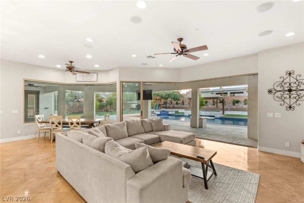 Private gated estate on nearly one acre in Paradise Hills. No HOA. This custom home features a dedicated office, theater room, and oversized loft across two stories of open living. The chef's kitchen is built around Sub-Zero refrigeration, a gas range, warming drawer, and a two-inch John Boos butcher block island. Pocketing glass doors open to a resort backyard with heated pool, elevated spa, expansive wet deck, and a full-size pickleball and basketball court surrounded by synthetic turf. An attached 3-car garage and detached 1,596 sq ft RV garage with full hookups handle everything from daily drivers to boats and trailers. Dual fireplaces, plantation shutters, paid-off solar, and an outdoor bath and shower round out the details. No HOA means no restrictions on vehicles, parking, or how you use your property. This is the kind of space, privacy, and freedom that doesn't come up often in Henderson.