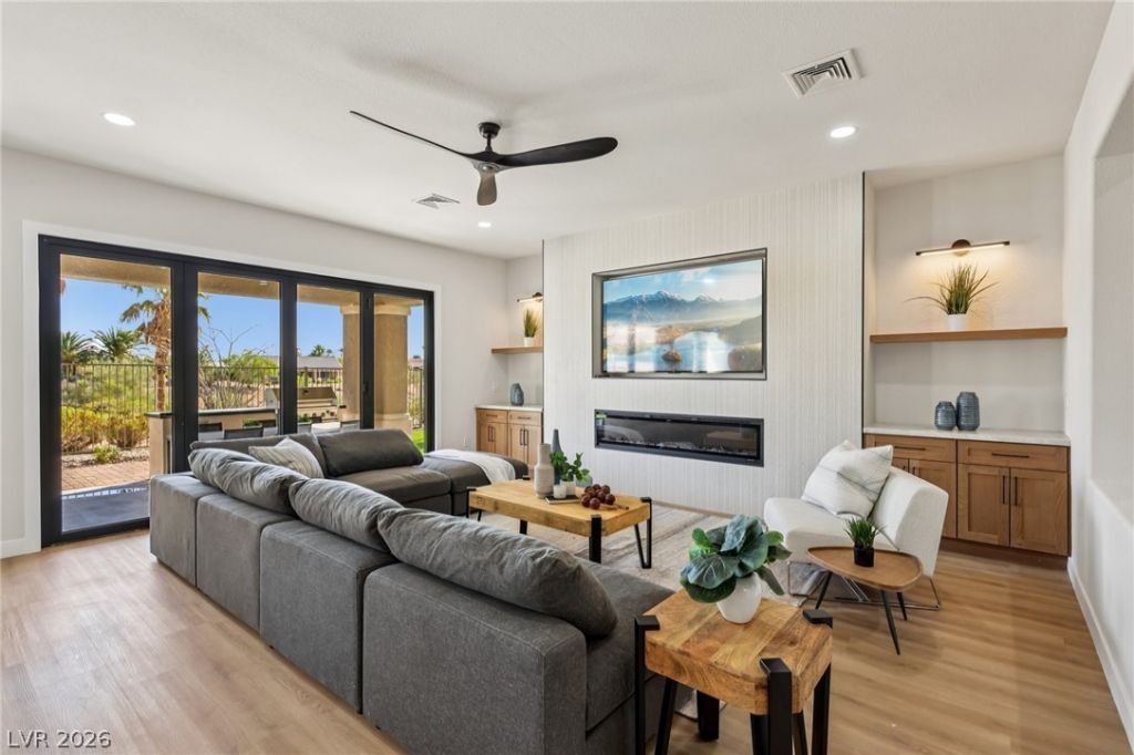 WELCOME TO YOUR OASIS ON THE GOLD COURSE - UNIQUELY SITUATED TO PROVIDE GREAT PRIVACY, YOU WILL FIND THIS FULLY REMODELED DESIGNER HOME WITH SEPARATE CASITA. UPGRADED W/ TOP QUALITY MATERIALS & FIXTURES INCLUDING BUT NOT LIMITED TO: NEW LUXURY VINYL PLANK FLOORS THROUGHOUT, FRESH INTERIOR & EXTERIOR PAINT, TWO TONE WHITE OAK CABINETRY W/ HIGH-END DESIGNER HARDWARE, CUSTOM FABRICATED TAJ MAHAL QUARTZITE COUNTERTOPS W/ OVERSIZED WATERFALL ISLAND, BRAND NEW LUXURY APPLIANCE PACKAGE IN THE KITCHEN, 2 CUSTOM BUILT LED FIREPLACES LOCATED IN THE FAMILY ROOM & PRIMARY BEDROOM, DESIGNER FIXTURES/FAUCETS/LIGHTING THROUGHOUT, A SPA STYLE PRIMARY BATH WITH HIS & HER VANITIES, CUSTOM TILED SHOWER W/ FREESTANDING TUB! FULL LANDSCAPE OVERHALL FRONT AND REAR! ENJOY THE GOLF COURSE VIEWS THROUGHOUT THE HOME. ENJOY YOUR OVERSIZED COVERED PATIO WITH OUTDOOR KITCHEN, AND BUILT IN FIRE PIT! THE HOME IS EVERYTHING YOU ARE LOOKING FOR IN THE BEST LOCATION IN SUMMERLIN.