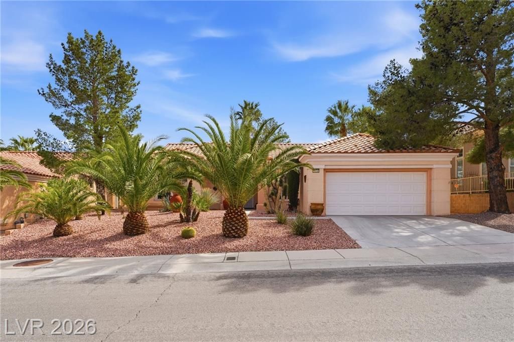 This well-maintained home in an age restricted 55+ master plan retirement community, has a fully fenced backyard with two side gates and over 100 lush plants, creating a private park like setting. Enjoy a large covered patio, perfect for relaxing or entertaining. The kitchen features granite countertops, a breakfast nook with sliding glass doors, new stainless steel stove and hood, and a new dishwasher. Travertine tile floors enhance the kitchen, baths equipped with grab bars, and family room, while both bedrooms have newer carpet. The primary suite offers backyard views, double sinks, spacious closet, and easy entry shower. The home includes shutters throughout, ceiling fans, updated fixtures, newer water heater, laundry room with storage, and garage workshop with golf cart space. Summerlin Sun City, consistently one of the countries top retirement communities, the home is minutes from Downtown Summerlin shopping, local golf courses, and community walking trails.