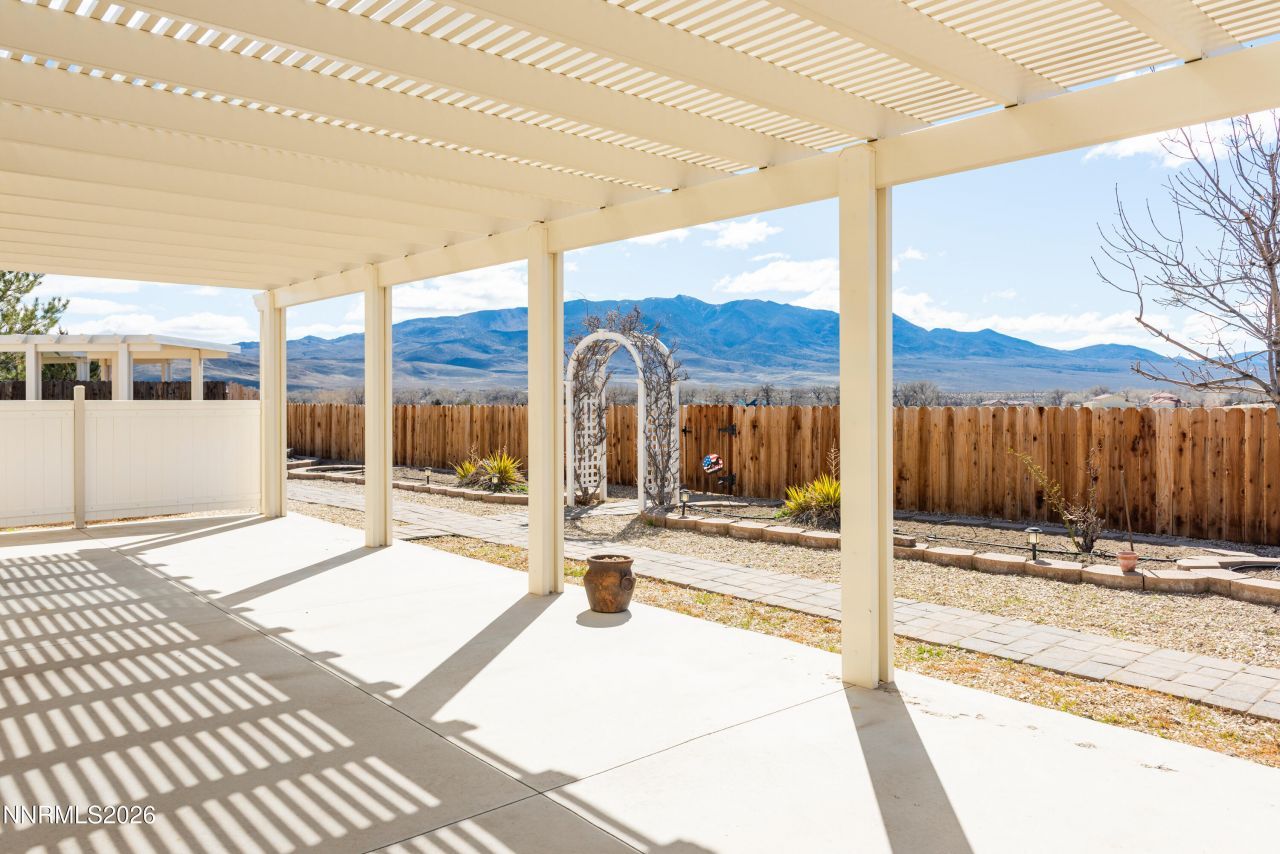 Spacious 4-bedroom, 3-bath home with a versatile bonus room ideal as a media room, home office, or craft space. The open-concept kitchen and living area features a gas log fireplace, pantry, and island/bar perfect for entertaining. The primary suite offers a walk-in closet, double sinks, shower stall, and soaking tub. The two guest bedrooms share a connecting bathroom. High-desert views of the Pine Nut and Virginia Mountains, with a peek-a-boo glimpse of the Sierra Nevadas, can be enjoyed from multiple rooms. Outdoor spaces are thoughtfully designed with concrete patios, paver pathways, pergola and trellis, offering low-maintenance areas for entertaining as well as a quiet space to enjoy the scenery. Additional features include a heated two-car garage, separate one-car garage, outdoor storage shed, oversized gate for RV/boat access, newer furnace and A/C (2020), and updated oven, range top, and microwave (2024). Conveniently located near shopping, dining, and historic downtown Dayton.