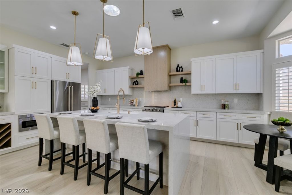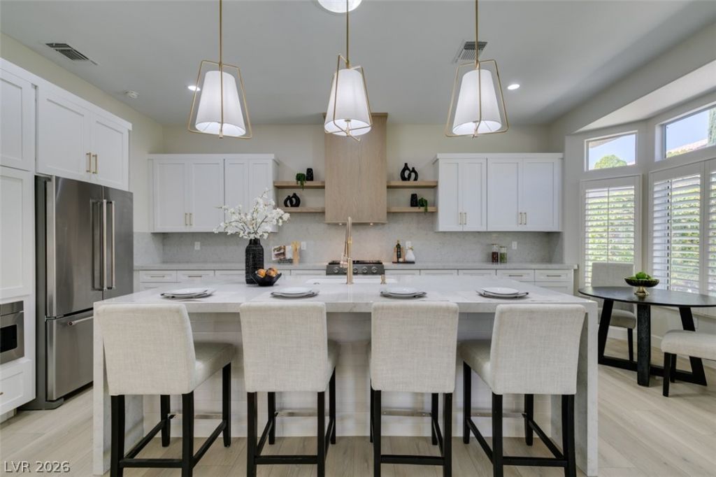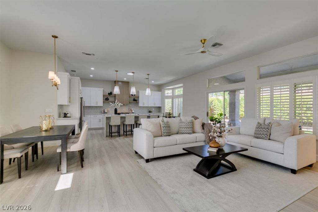 Re-imagined Tahoe model by an interior designer! This magazine-worthy home blends warmth, style & thoughtful design. A reconfigured kitchen features a dramatic waterfall island, quartz surfaces, & high-end appliances delivering both beauty & performance. It opens to a spacious living/dining space, where natural light, clean lines & warm tones are both sophisticated and relaxed. The seamless indoor-outdoor living is perfect for gatherings or quiet evenings in a private front courtyard or a serene backyard surrounded by mature landscaping. The primary suite is a peaceful retreat with a beautiful bathroom & walk-in closet. A second bedroom offers comfort to guests. An office by the kitchen is ideal for remote work or hobbies. This standout home is a complete reimagining of how a home should feel: elevated, effortless, & undeniably stylish. Sun City Summerlin has world-class amenities-3 clubhouses & golf courses: multiple pools, fitness centers, social clubs, theater, pickleball, etc.
