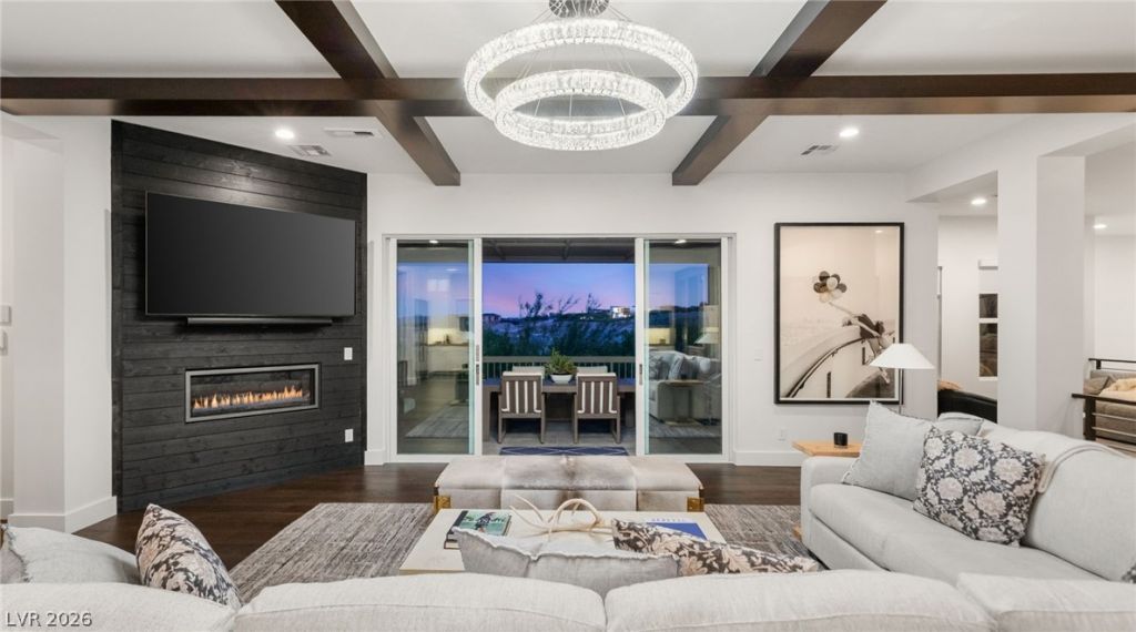 Located in the guard-gated community of The Ridges?Fairway Hills, this residence showcases elevated design and exceptional craftsmanship throughout. The chef's kitchen features Sub-Zero and Wolf appliances, dual dishwashers, cooling drawers, and multiple wine refrigerators, complemented by quartz surfaces and custom cabinetry. Thoughtful details include bespoke closets and a pantry, designer lighting, Robern LED mirrors, and Kohler Purist fixtures. The great room is enhanced by ceiling beams, custom millwork, and a striking wine and media wall. Motorized shades and luxury vinyl plank flooring add comfort and style. A private main-level terrace captures captivating Strip and city views. Offering four bedrooms, a loft, a secondary living area, and an office, this home blends sophistication with functionality. Residents enjoy access to Club Ridges amenities, including pool, tennis, and fitness center.