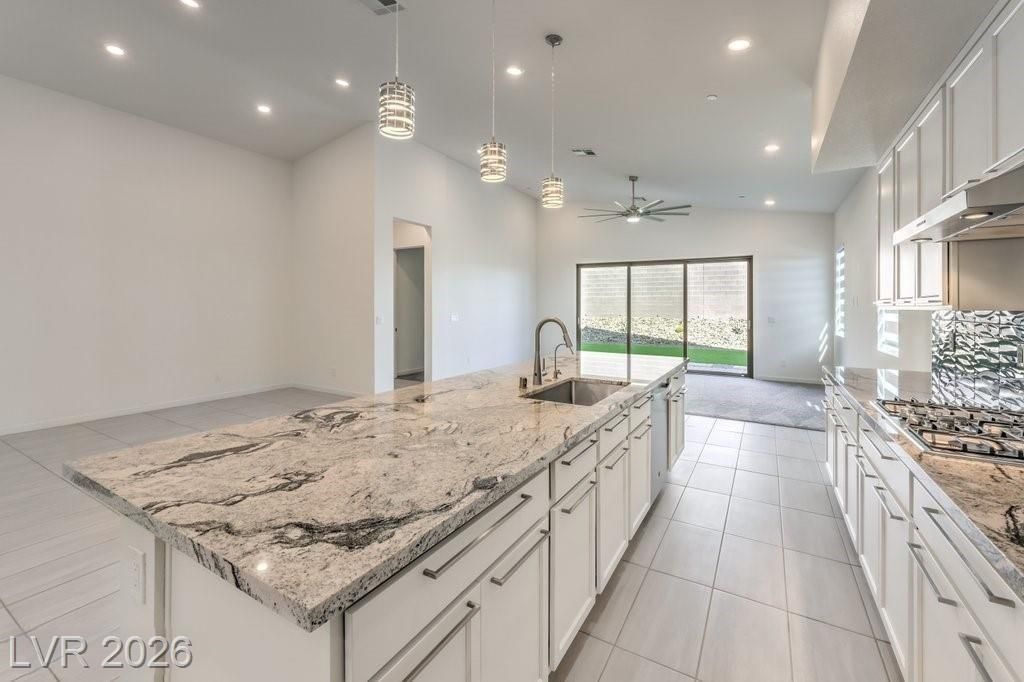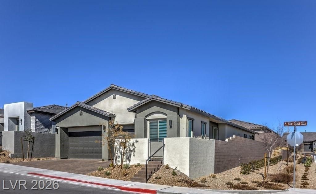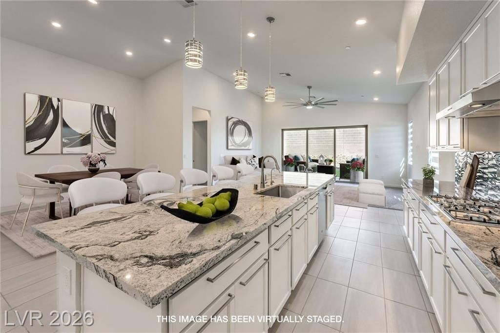 Summerlin Luxury Single-Story Rental | 4BR Corner Lot in Gated Savannah at Redpoint. This stunning single-story residence offers 4 bedrooms, 3 full baths, and a 3-car garage. Inviting front courtyard with Strip views welcomes you inside to vaulted ceilings, porcelain tile flooring, and a bright open floor plan. The gourmet chef's kitchen features white shaker cabinets, glass tile backsplash, Viscount White granite island, farmhouse sink, pendant lighting, stainless steel appliances, and a large walk-in pantry. Spacious living room and owner's suite include oversized designer ceiling fans and privacy blinds. The private primary suite offers a spa-like bath and large walk-in closet. Enjoy seamless indoor-outdoor living with a 12-ft disappearing sliding glass door opening to a covered paver patio, turf yard, and BBQ stub. Tankless water heater and fiber internet available. Steps away from beautiful walking trails, minutes to Downtown Summerlin, Red Rock Casino, parks, shopping, & dining.