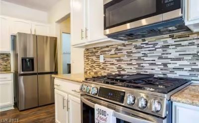 Exceptional multi-generational home with private mother-in-law quarters featuring a full kitchen and separate entrance. This beautifully renovated North Las Vegas residence is truly move-in ready and offers flexible upstairs living ideal for extended family or guests. Recent upgrades include new wood/laminate flooring, plush carpet, modern blinds, fresh interior and exterior paint, high-end stainless steel kitchen appliances, and a new washer and dryer. The garage floor features a durable epoxy coating. The home also includes a new HVAC system with dual-zone thermostats. Energy-efficient features include solar panels and solar window screens. The large, fully walled backyard offers privacy with new landscaping, hardscaping, shaded pergola, and tool shed. The third-car garage has been converted into a versatile studio, perfect for a gym, office, hobby room, or storage. A rare opportunity offering luxury upgrades, energy efficiency, and flexible living ? a must-see! Rent includes power!