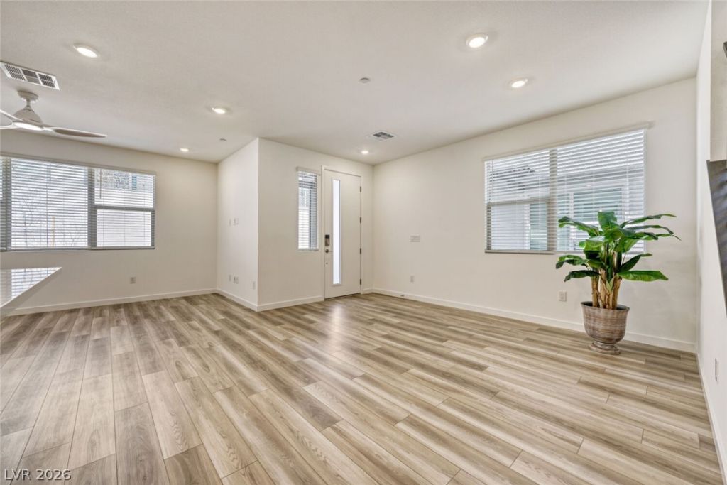 West Summerlin - Brand New - This contemporary home is just under 2200 ft.² Can be leased FULLY FURNISHED or NOT. Open concept, high ceilings, designer kitchen with center island, upgraded cabinets, and quartz counters touch-less faucet. A 1st-floor bedroom w/full bath. Upstairs features secondary bedrooms, a full bath, a laundry room, and a large loft. The primary suite is separate from the rest, walk-in closet, and a private balcony. All bedrooms have ceiling fans. Elevated finishes include touch-less kitchen faucet, comfort height toilets, 8' interior doors, designer tile shower surrounds, finished garage, 220V EV charging, and insulation between floors. Perfectly positioned along tree-lined trails in beautiful Kestrel Commons Village, moments from the 215?this home defines modern luxury living in Summerlin.