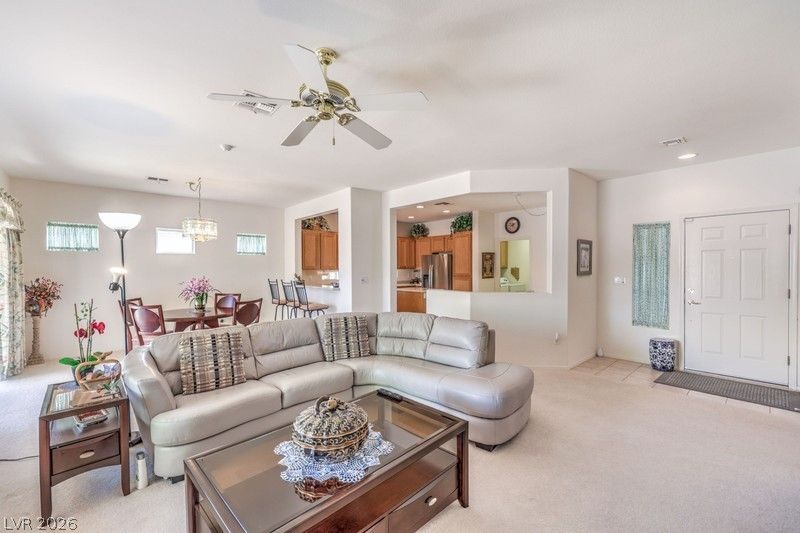 Experience the best of Sun City Anthem in this neat residence, perfectly positioned on an oversized 12,632 sq. ft. lot with no rear neighbors for added privacy. The home features a gated front courtyard, providing a private and welcoming entrance. Inside, the open-concept layout includes a kitchen with a breakfast bar and center island. The living room, den, and dining area all capture the endless blue skies and natural beauty of the desert landscape through high-clearance windows. From the expansive backyard oasis, you look out directly toward the grounds of the prestigious Anthem Country Club, providing a sense of exclusivity and wide-open space. Enjoy world-class community amenities of Sun City Anthem including clubhouses, fitness centers, pools, and social clubs?all while living moments away from premier golfing. This is Henderson living at its finest!