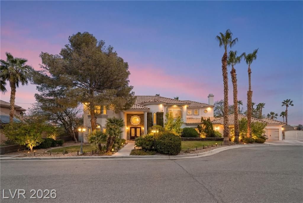 Rare opportunity in Section 10! Located in an exclusive nine-home gated enclave, this custom estate sits on a premier ½-acre lot just minutes from Canyon Gate Country Club, Downtown Summerlin, and the Las Vegas Strip. Grand iron entry doors open to 22-ft ceilings and a sweeping staircase. The chef's kitchen features dual oversized islands, built-in refrigeration, and new sliding glass doors leading to the backyard. The primary suite includes a two-way fireplace and a remodeled spa bath with jetted soaking tub. Resort-style backyard with pool, spa, rock waterfall and slide, built-in BBQ, and fire-pit lounge, ideal for entertaining. Three-car garage plus secure gated RV/boat parking. Updated with new flooring, designer paint, and dual pane windows, while still offering the opportunity to add your own personal touches. A standout Section 10 property that rarely becomes available.