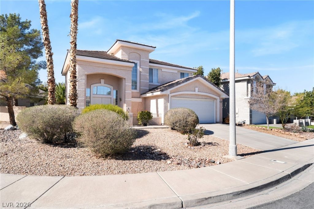 Located in the desirable Green Valley community of Henderson, this two story home sits on a corner lot near a neighborhood park and playground. The open floor plan features soaring ceilings, abundant natural light, and upgraded flooring throughout the main living areas. The kitchen offers stainless steel appliances, ample cabinetry, and a breakfast bar that opens to the family room with fireplace. Upstairs, the spacious primary suite includes a private balcony overlooking the backyard, dual vanities, separate tub and shower, and generous closet space. Step outside to enjoy a sparkling pool and spa, mature palm trees, and a covered patio ideal for relaxing or entertaining. Conveniently located near parks, shopping, dining, and schools.