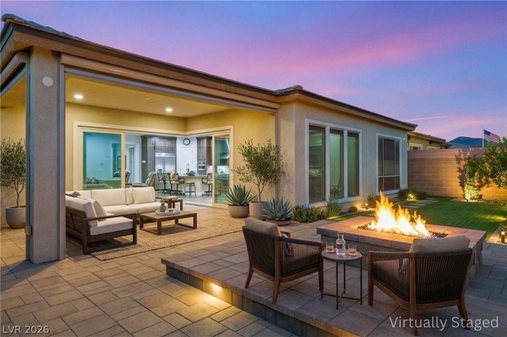 Set on an elevated lot with sweeping valley and mountain views, this single-story home offers privacy, design, and seamless indoor-outdoor living. Spanning approximately 2,400 sqft., the residence features 3 bedrooms, 2.5 baths, a dedicated den, and a 3 car garage! The open great room is filled with natural light and opens to the backyard through expansive sliding doors, creating a true extension of the living space. Wide plank flooring, recessed lighting, and clean architectural lines frame the interior. The chef's kitchen features rich cabinetry, premium appliances, and a large center island ideal for gathering. The primary suite is privately positioned with a spa-like shower and generous closet space. The den offers flexibility as an office or media room. Outdoors, enjoy unobstructed views, a covered patio, custom hardscape, fire feature, and beautifully landscaped grounds, perfect for sunsets and entertaining.