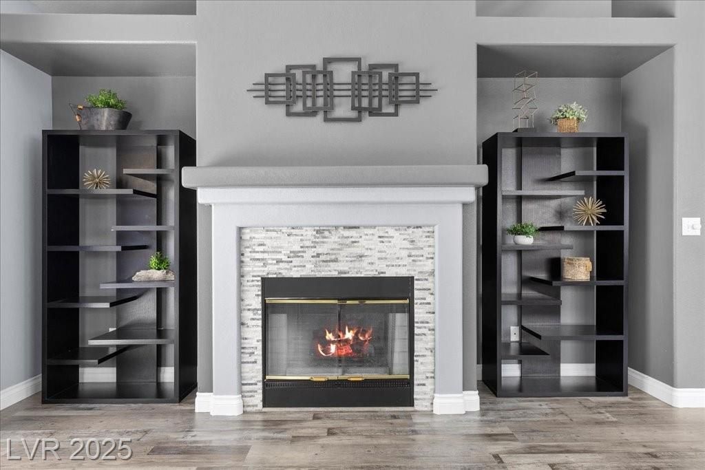 Refined single-story living with timeless design and elevated finishes. This exceptional home features a bright, open floorplan filled with natural light and thoughtfully curated upgrades throughout. The kitchen showcases gleaming granite countertops, classic white subway tile backsplash, stainless steel appliances, and luxury plank vinyl flooring. Designer lighting, shutters, and a sophisticated neutral palette throughout. Expansive living spaces include a grand living room with a pitched ceiling and a striking two-way fireplace shared with the family room. An open office area adds flexibility, alongside three bedrooms and a versatile flex room ideal for an office/den or creative space. Outdoors, enjoy fresh landscaping, a spacious covered patio, and a heated pool and spa for year-round enjoyment. A three-car garage and storage shed add exceptional functionality. Approximately 15 minutes from the Las Vegas Strip in a quiet cul-de-sac enclave of just 18 single-story homes with no HOA.