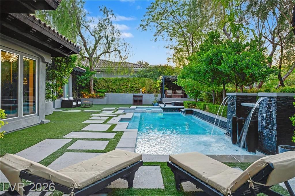 Welcome to an exceptional residence in the highly sought-after Guard gated community of The Ridges. From the moment you enter this single story home, you're greeted by dramatic architectural details, including a stunning coffered ceiling, a statement chandelier and piano that anchors the main living space. Expansive windows flood the home with natural light while seamlessly connecting indoor and outdoor living. The chef's kitchen is both functional and striking, featuring sleek countertops, custom cabinetry, and a large island perfect for entertaining. Step outside to your private oasis?complete with a modern-style pool, clean-lined hardscape and mature landscaping that offers both privacy and ambiance. Whether hosting guests or enjoying a quiet evening, this outdoor space is designed for elevated living. With refined finishes, thoughtful design, and an effortless indoor-outdoor flow, this home embodies the best of Las Vegas luxury living. Furniture included with sale.