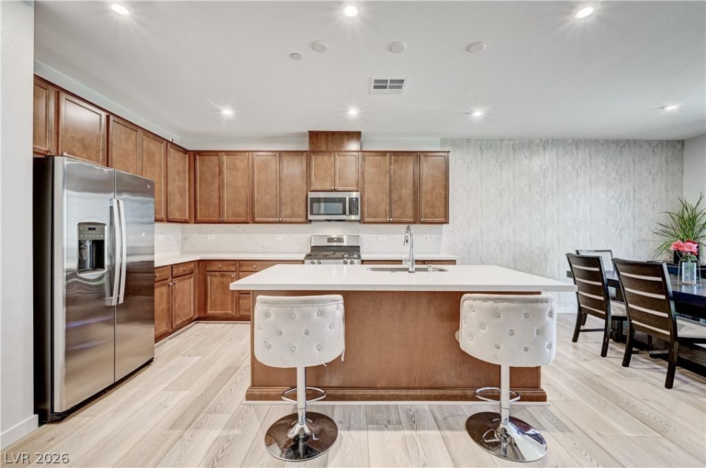 This two-story townhome located in the sought-after Inspirada community. This modern home features an open and inviting floor plan perfect for comfortable living. The kitchen offers sleek quartz countertops, a large center island, white cabinetry, and stainless-steel appliances, creating a clean and contemporary space for cooking and entertaining. The living area flows seamlessly from the kitchen and looks out to the private backyard, bringing in plenty of natural light. Upstairs you'll find a versatile loft space, convenient laundry room, and three bedrooms including a spacious primary suite. The primary bedroom features a private en-suite bathroom with dual-tone cabinetry and a shower/tub combination. Located in a vibrant master-planned community known for its parks, trails, and amenities, this home offers modern style and everyday convenience.