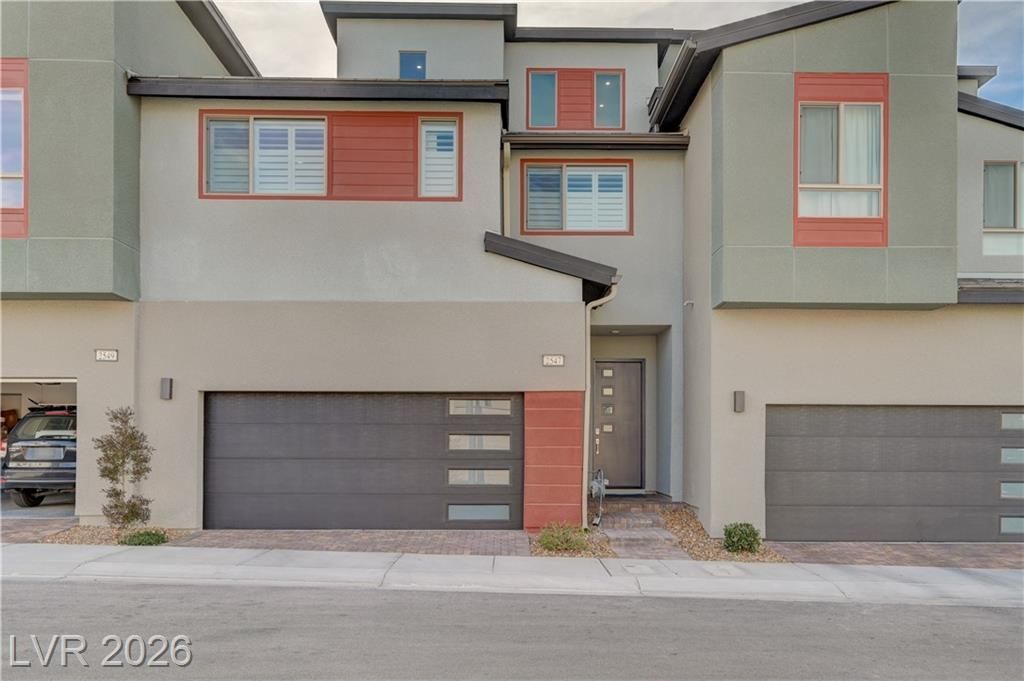 Like-new three-story townhome in Inspirada by Tri Pointe Homes featuring Norman Woodlore shutters throughout. Open floor plan with spacious kitchen offering stainless steel appliances, quartz countertops, and stone sink, seamlessly connected to living and dining areas. Second floor includes primary bedroom, laundry room, two bathrooms, and two additional bedrooms. Third floor features a large loft and private balcony with mountain views. Well-designed layout with numerous upgrades?move-in ready.