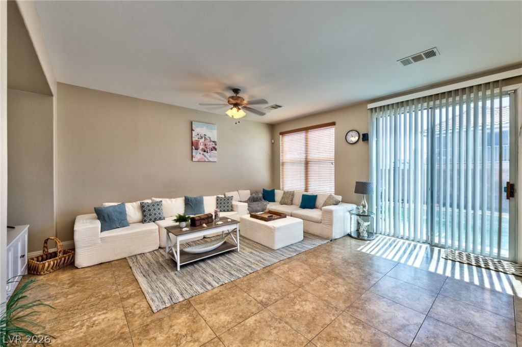 Spacious 4 bedroom, 2.5 bath home on a corner lot in a small gated North Las Vegas community near shopping, dining, the VA hospital, and major highways. Designed for comfort and entertaining, the main level features tile flooring, a formal dining room, and separate living and family rooms. The updated kitchen showcases refreshed cabinets, stainless steel appliances, and all appliances included. The oversized primary suite offers a sitting area or office and a cozy three-way fireplace. Enjoy a luxurious ensuite bath with a soaking tub, separate shower, dual vanities, and a walk-in closet. Upstairs also includes generously sized guest bedrooms, a full bath, and a versatile loft. The backyard features low-maintenance synthetic grass and gravel landscaping. Energy-efficient living with fully paid-off solar panels.