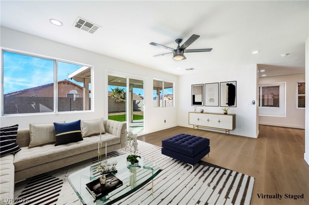 Located just minutes from Nellis Air Force Base, this move-in-ready, newly remodeled two-story home offers 4 bedrooms and a spacious backyard with an attached covered patio?perfect for outdoor entertaining. Inside you will have abundant natural light, ceiling fans, modern light fixtures, laminate wood flooring, and plush carpet throughout. The kitchen features a garden view, recessed lighting, custom countertops, cabinetry with gold hardware, and stainless steel appliances. Upgraded bathrooms showcase custom floating vanities with oval framed mirrors, contemporary lighting, beautifully tiled showers with built-in niches, and rainfall shower heads.