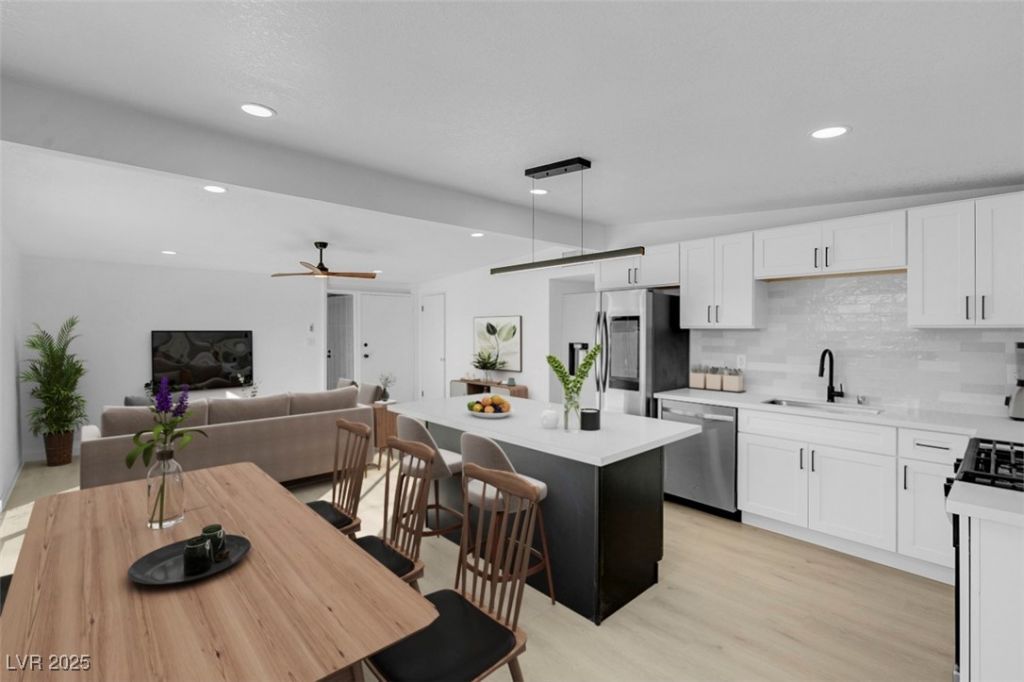 This home hits ALL the bells and whistles. Fully renovated 3-bed, 2-bath home w/ PAID-OFF SOLAR, POOL & NO HOA and a GARAGE! Open floor plan w/ modern finishes, stylish flooring & custom details throughout. Kitchen features brand new countertops, premium appliances & custom cabinets. Primary suite has private ensuite bath. Backyard is a private retreat w/ sparkling pool, perfect for relaxing or entertaining. Detached 1-car garage w/ brand-new door plus a NEW HVAC system & water heater for peace of mind. Prime location near I-15 & US-95, just mins from Downtown LV, Arts District, shopping & dining. Low energy costs & move-in ready -- don't miss out!!!