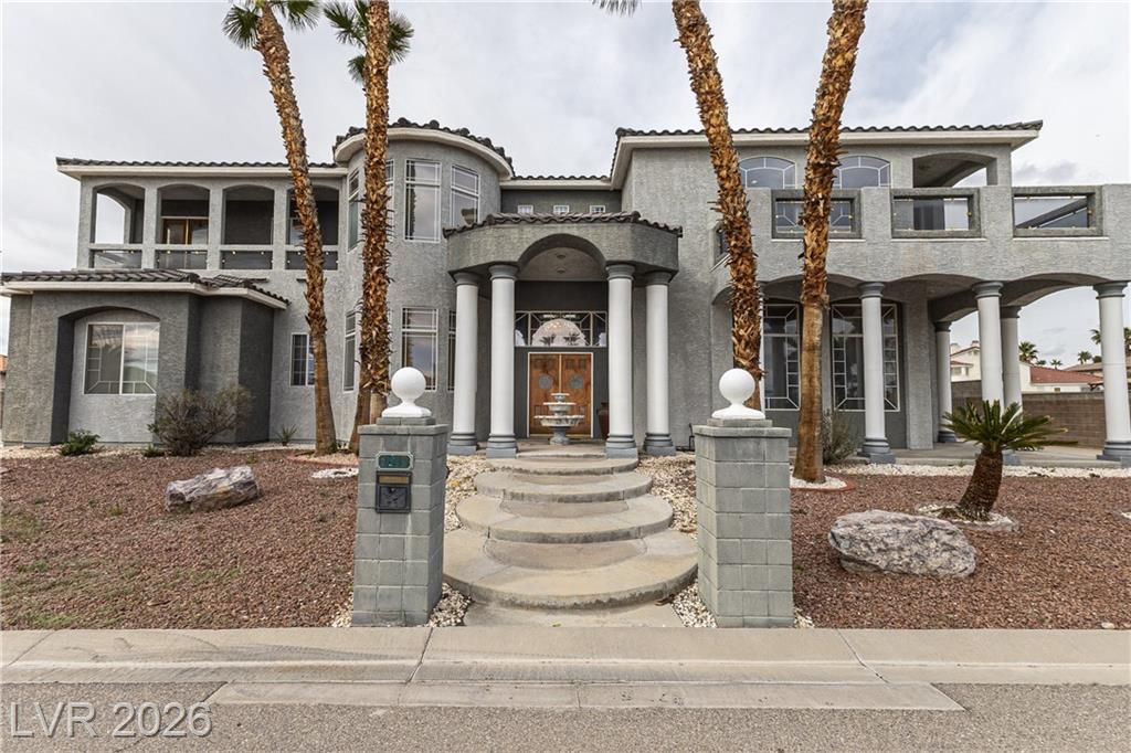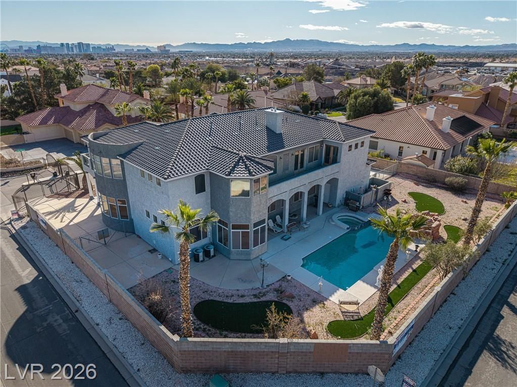 Built by the current owner using the finest European materials and finishes, this custom residence sits in a gated cul-de-sac in highly desirable Section 10 with no HOA. The property offers an oversized 4-car garage, separate gated RV and boat parking, and a sparkling pool and spa with a waterfall. Every bedroom opens to a private balcony, and every bathroom includes a bidet. The kitchen features double ovens, a trash compactor, and a separate butler's pantry adjoining the formal dining room with a wet bar. Enjoy views of the Strip and surrounding mountains, with contemporary touches throughout. A true Diamond in the Rough, ready for your personal updates to create the home of your dreams. Set on an expansive lot with mature landscaping, the home welcomes abundant natural light and open living areas ideal for entertaining. The gated cul-de-sac offers privacy and security while remaining minutes from shopping and dining. Flexible spaces allow for a home office, gym, or theater.