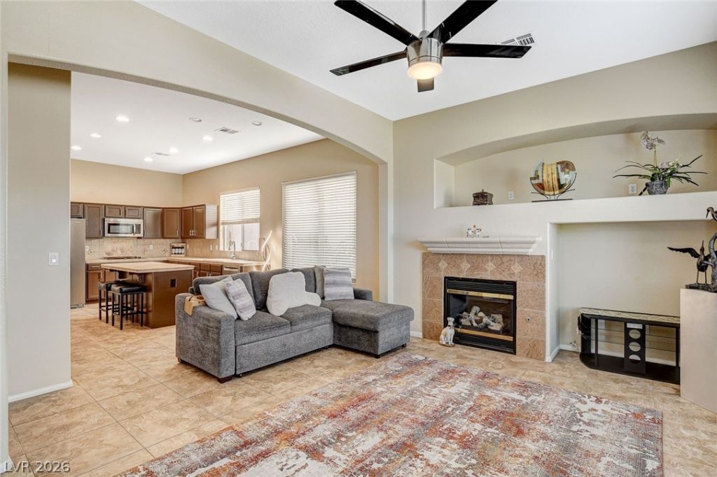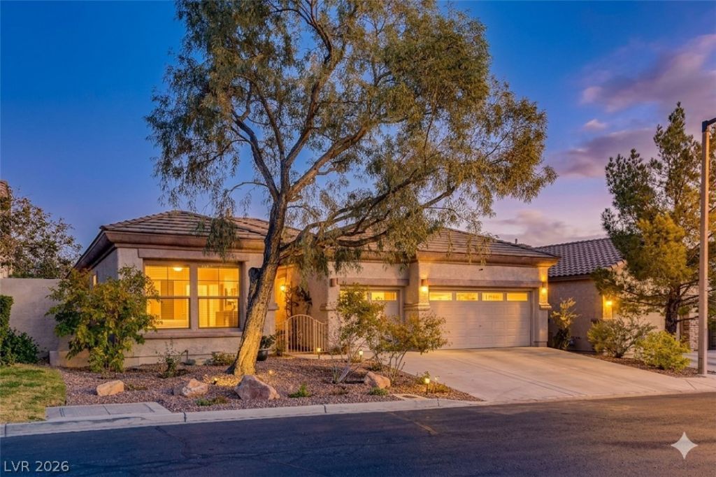 Single-story Summerlin home in gated community near Downtown Summerlin, Las Vegas Ballpark, Red Rock Casino, trail access and the 215 Beltway. This 3-bedroom, 2.5-bath home offers 2,313 sq ft with open living and dining areas plus a separate den for office or media use. Kitchen opens to the main living area and includes island seating, gas cooktop, built-in oven, microwave and dishwasher; adjacent family room includes a gas fireplace. Primary suite features a remodeled bath with walk-in shower. Covered patio, private yard, block wall fencing, no rear neighbors, desert landscaping, trees, garden space and a producing citrus tree. Many Andersen double-pane windows, ceramic tile flooring, ceiling fans, main-level laundry, security system, water softener, 3-car attached garage with inside entrance, and A/C updated in 2023. Community amenities include pool, tennis courts, basketball court, playground and park. Includes 3D tour.