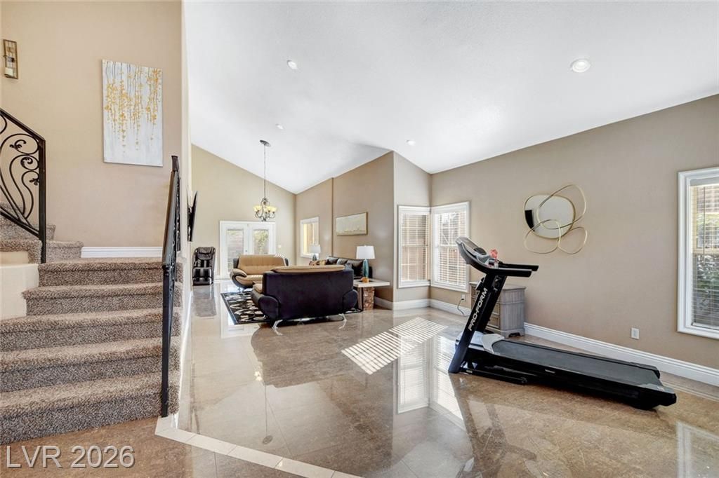 Gorgeous spacious house with 4 bedrooms and 3.5 baths in a quiet community. Great turn key home. Tile flooring through out the kitchen and living room. Completely remodeled beautiful kitchen, granite countertops. A decent size bedroom with full bath downstairs. Nice size primary bedroom with high ceiling and balcony. Double walk in closets. Dual vanities. Separate bathtub and upgraded standing shower in master bath. Open vaulted ceiling when you enter into the sunken living room and adjacent to the dining area. Big low maintenance backyard with covered patio. Newer water heater and stainless steel refrigerator. Central located, close to shopping and dining, the Lakes, Summerlin and Chinatown. NO HOA! A must see!!! TV, furniture and decorations are negotiable, which can stay or be removed.