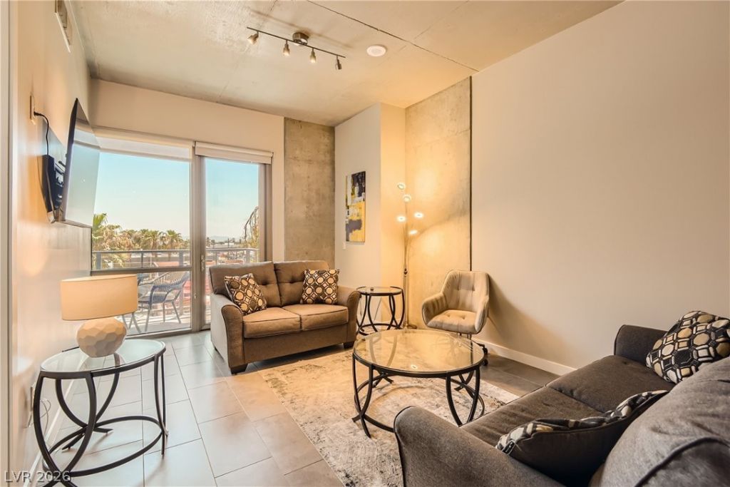 Urban living at its finest in this spacious, open floor plan loft-style condo located at Juhl in the heart of downtown Las Vegas. This exceptional 1 BD/1 BA unit seamlessly blends contemporary design with urban flair. The large kitchen boasts tile flooring, granite countertops, stainless steel appliances and breakfast bar. Spacious Great Room opens to the Terrace, perfect for relaxation or Entertainment. Primary Bedroom with walk-in closet and Ensuite. Residents can take full advantage of the many amenities designed to inspire engagement and relaxation, including cocktails on the Vino Deck, unwinding poolside at the resort style pool with cabanas , enjoying a film in the alfresco movie theater, or utilizing the working lounge and two-story fitness center. Within easy access to the Art District, The Smith Center, Las Vegas Academy of Arts and more..