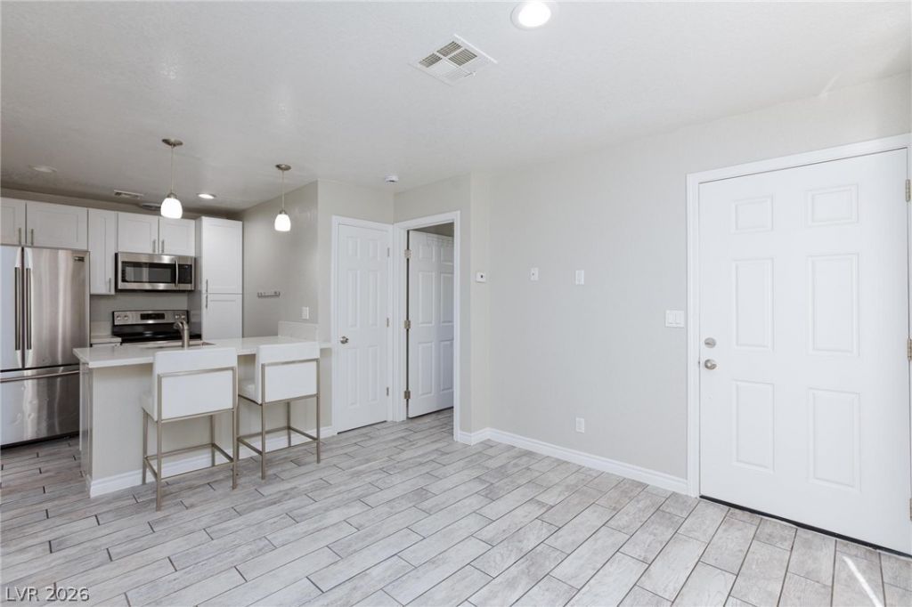 Move-in ready and absolutely stunning! Located in a gated community, this bright and beautifully updated unit features quartz kitchen countertops and sleek stainless steel appliances. Stack washer and dryer conveniently located in the bathroom. Gorgeous wood-look tile flooring throughout and freshly painted modern gray tones create a clean, contemporary feel. The primary bedroom offers a spacious walk-in closet. Covered parking is directly in front of the unit for ultimate convenience. Prime location, walk to the Rio, close to shopping, dining, and just minutes from the Las Vegas Strip. Small but mighty, stylish, and a fantastic investment opportunity, just bring your toothbrush!