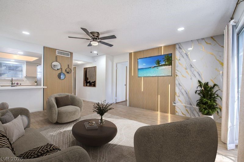 Beautifully renovated residence located within the French Oaks gated community, offering modern luxury and a prime central Las Vegas location. The home has been completely updated with brand-new luxury flooring, creating a clean, contemporary feel throughout, and fully remodeled bathrooms featuring elegant walk-in tiled showers delivering a spa inspired experiance. The kitchen features modern upgrades for both style and functionality, while custom luxury wood-panel accent walls with integrated LED lighting add a refined, contemporary touch to the living space. Ideally situated approximately two miles from the Las Vegas Strip and the Sphere, this property provides quick access to world-class dining, entertainment, shopping, and major employment centers, while still offering privacy and security. A turnkey rental opportunity for tenants seeking upscale finishes, modern design, and exceptional proximity to the heart of Las Vegas.