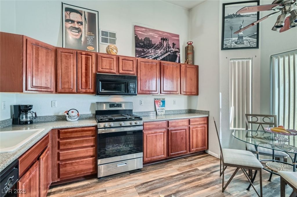 Spectacular second-floor condo located in a gated community with tons of charm and upgrades! Step inside to find newer luxury vinyl flooring, ceiling fans, and vaulted ceilings that make the space feel open and airy. The smart floorplan features totally separate primary and secondary bedrooms, offering privacy and comfort for everyone. The sunny eat-in breakfast nook opens to a beautifully upgraded kitchen with granite countertops, ample cabinet space, a microwave, refrigerator, and washer & dryer included! Spacious living room with cozy fireplace. The primary suite is a relaxing retreat with a walk-in closet, dual sinks, garden-style soaking tub, and a separate shower. Enjoy your morning coffee or evening unwind on the private balcony with mountain views. The gated community offers access to a sparkling pool and spa, perfect for enjoying sunny days. This move-in-ready condo is the ideal blend of comfort, convenience, and style?don't miss out!