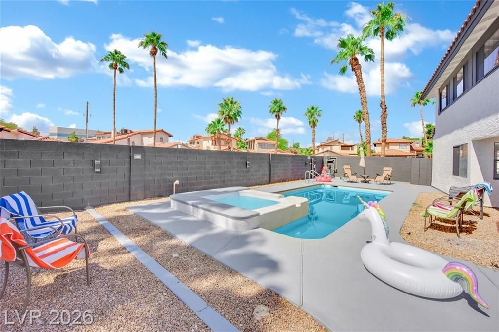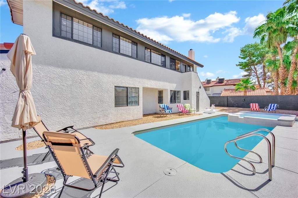 Welcome to your private oasis in Las Vegas! This beautifully updated home sits on a desirable corner lot in a sought-after NO HOA community, located approximately 10 minutes from the Las Vegas Strip and Harry Reid International Airport, offering both convenience and comfortable residential living. Inside, you'll find a thoughtfully renovated interior featuring a stunning kitchen with quartz countertops, custom cabinetry, and stainless steel appliances. A rare highlight is two primary suites, ideal for flexible living. The expansive upstairs suite includes a spa-style wet room, dual closets, custom dog wash, and attached flex room perfect for an office or gym, with private stairs to the backyard. The first-floor primary suite features a custom walk-in shower. Step outside to your resort-style backyard with a recently resurfaced pool and spa, perfect for relaxing or entertaining.
