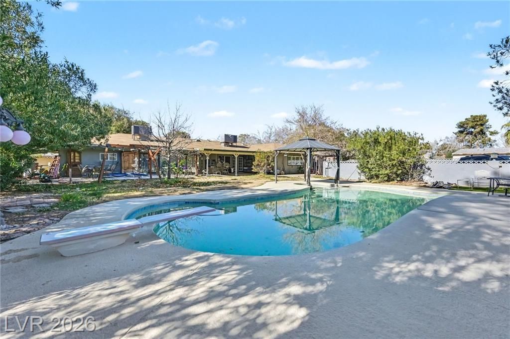 Tucked in one of Vegas' most desirable neighborhoods, this custom single-story home offers 3BR/2BA plus an attached mother-in-law suite with private entrance, kitchen, laundry, walk-in closets & step-down shower?once part of the main home, creating a potential 5BR layout. The kitchen greets you with a large window overlooking a whimsical backyard with grape vines, fruit trees & grass. The pool, which has a built in diving board, is a refreshing way to enjoy your summers in your new backyard. Brick details, load-bearing walls, primary suite with backyard access & custom tub, gated parking, RV space, and restored front yard. Strong bones, endless potential, no HOA, minutes from Strip & airport.