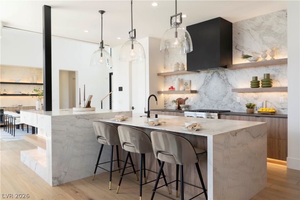 Located within The Estates at Lone Mountain, this turnkey, half-acre custom home is the final residence in this exclusive nine-lot community. This Spire plan includes options of the MultiGen suite & and the upstairs 5th bd, offering a gated 5 bd & 5 & a 1/2 bth. The exterior showcases a bold metal-clad roof paired w/ natural wood & limestone for a timeless appearance. Inside, a warm modern design emphasizes the use of organic materials. Marble countertops & accent walls, limestone fireplaces, & warm wood cabinetry and flooring create a cohesive palette that feels refined. Floor-to-ceiling windows fill the home w/ natural light & frame beautiful views of Lone Mountain. Additional features include an attached RV garage, heated pool & spa, fully landscaped lot, private entry courtyard, outdoor shower, minimal HOA restrictions, Control4 smart home technology, & an integrated sound and security system for a seamless blend of comfort & sophistication