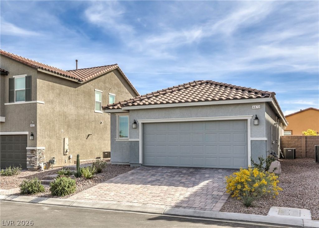 Built in 2023 and tucked inside a small gated community near Southern Highlands shopping with quick I-15 access, this light-filled, single-story home blends modern design with everyday convenience. Offering 2 bedrooms, 2 baths, and a flexible room ideal for an office, nursery, playroom, or easy 3rd bedroom conversion. The primary suite features a ¾ bath and thoughtful layout. The kitchen showcases stainless steel appliances, including a brand-new smart LG refrigerator, and the brand new smart LG washer & dryer are also included with the sale. Smart thermostats and a 220V garage outlet ready for practical use or EV charging add comfort and efficiency. Step outside to a newly added paver patio, perfect for BBQs and relaxing evenings. Low HOA and low-maintenance landscaping make this home easy to enjoy. Furniture is optional. Call agent to schedule a showing today!