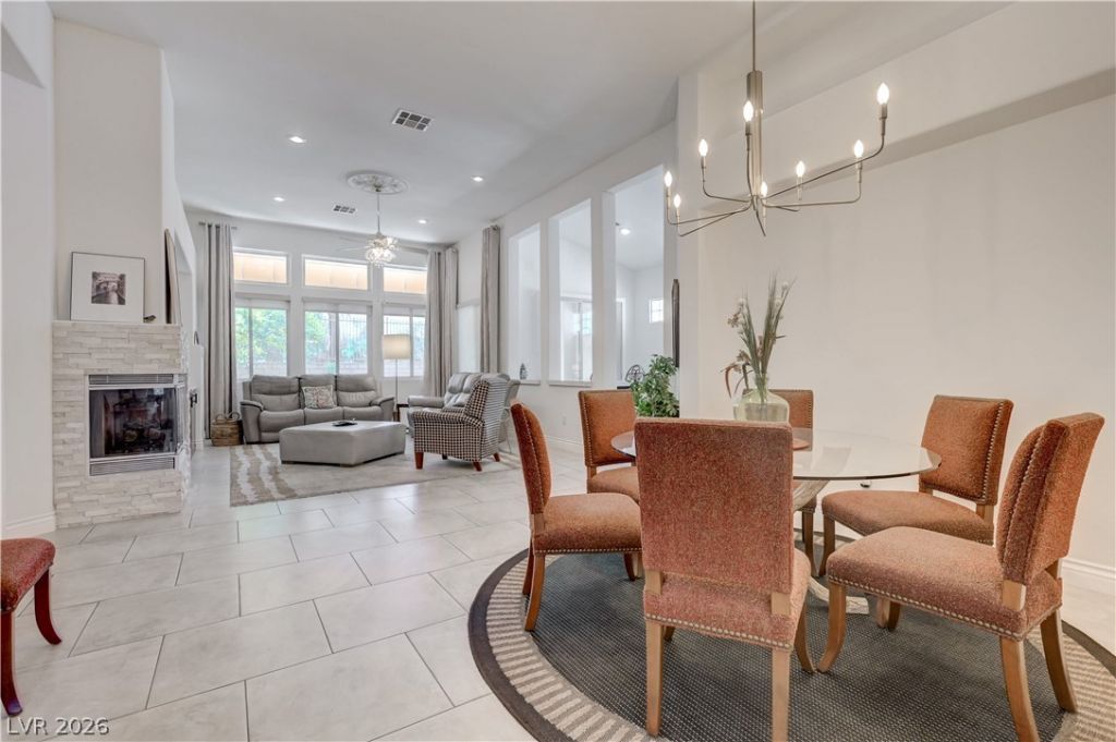 Refined single story living in the guard gated Resort Villas, backing directly to Wildhorse Golf Course. This upgraded home features tall ceilings, a cozy fireplace, and a remodeled kitchen with Bosch appliances, double ovens, and an electric cooktop. Bathrooms offer glass-enclosed showers and a soaking tub in the primary suite. Interior highlights include porcelain tile flooring, plantation shutters, office built-ins, and new baseboards. Major improvements include high-efficiency heat pump HVAC, updated water heater, water softener, and under-sink filtration. Enjoy a professionally redesigned, low-maintenance backyard with desert landscaping and golf course views. Furniture may be negotiated separately. Community amenities include a clubhouse, pool, spa, fitness center, tennis & pickleball courts, park, and 24/7 security. Minutes from Green Valley Ranch, Sunset Park, Las Vegas airport, and the Strip.