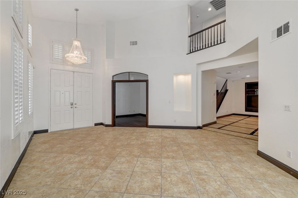 Welcome to 4721 Jasper Rock Court, a highly upgraded 5-bedroom, 3-bathroom residence tucked away on a quiet cul-de-sac in a prime Southwest location, directly across from Spanish Trails. Designed with sophistication in mind, the home features multiple crystal chandeliers as statement pieces in nearly every room, dramatic wood & stone flooring throughout, fresh paint, soaring vaulted ceilings, & an abundance of natural light. The gourmet kitchen showcases granite countertops, custom cabinetry, stainless steel appliances, & plenty of storage. Oversized bedrooms provide both comfort & flexibility, including a first-floor bedroom & three-quarter bath ideal for guests or multi-generational living. Step outside to enjoy a private retreat, an oversized backyard with a sparkling pool & spa, perfect for entertaining or relaxing under the Vegas sun. Additional highlights include a spacious laundry room with sink & cabinets, & an oversized three-car garage equipped with overhead storage racks.