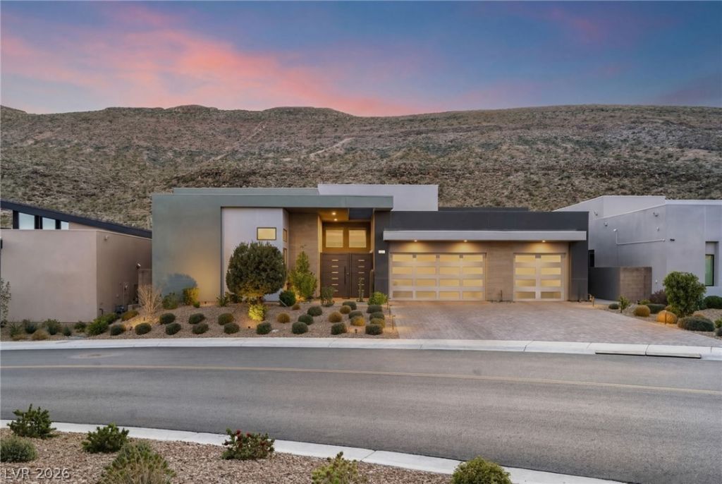 This fully furnished modern masterpiece is set on an ultra-private lot with no rear neighbors, backing directly to the mountains for a truly serene backdrop. From the moment you enter through the private courtyard, you're welcomed by a tranquil water feature that sets the tone and seamlessly connects to the cascading waterfalls of the backyard pool. Inside, soaring ceilings and expansive windows flood the home with natural light, creating an open and airy atmosphere throughout. The chef's kitchen is a showpiece, featuring a striking double island, stacked flat-panel cabinetry, and top-of-the-line Sub-Zero and Wolf appliances. This single-story home offers four spacious en-suite bedrooms, along with a versatile flex space. Custom built-in closet systems elevate both style and functionality. Outdoors, the experience continues with a resort-style pool and spa, complete with waterfalls and a built-in BBQ. Located within the exclusive Guard-Gated community of Mesa Ridge in Summerlin South.