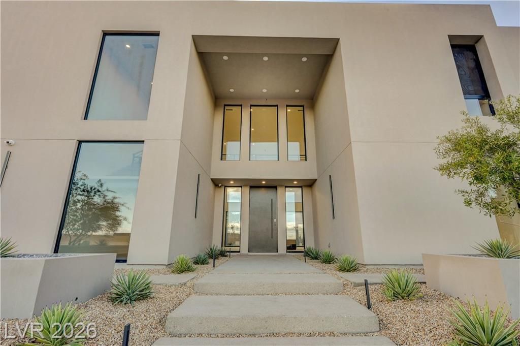 Gated modern new construction on a rare ½-acre with no HOA?minutes to the Strip, Allegiant Stadium, and the airport. Approximately 5,889 SF with 4 ensuite bedrooms, office and 6 baths. Dramatic 24' great-room ceiling anchors an indoor/outdoor plan with a 24' x 10' multi-slide door and an architectural aluminum window wall (low-E, argon filled). Chef's kitchen features JennAir Pro appliances and an oversized island. Luxuries include a private elevator, two laundry rooms, and 10' bedroom ceilings. Resort yard showcases a sparkling pool, expansive patios, and room to play on the ½-acre lot. 3-car garage; flat-roof modern silhouette; crisp finishes throughout. A rare combination of scale, design, and convenience in 89118?built for seamless desert living.