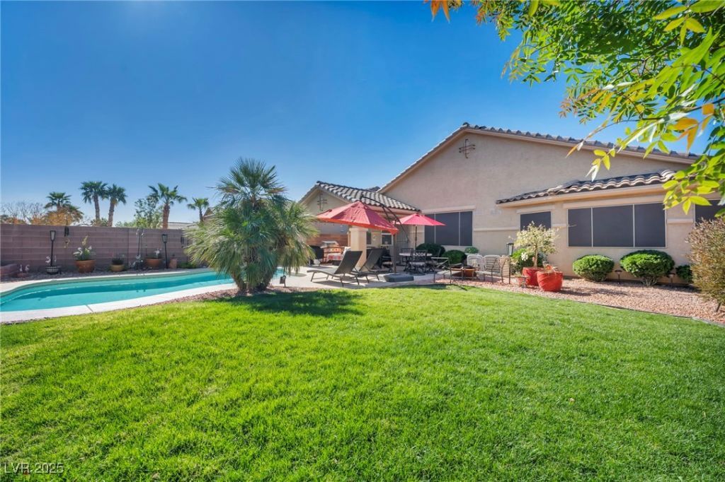 Welcome to 5578 River Highlands Place! Nestled within Stallion Mountain Golf Community, this beautifully maintained home offers a perfect blend of comfort and style. As you enter, you'll be greeted by a charming enclosed sitting nook. The open floor plan features high, vaulted ceilings. The large primary bedroom is a true retreat, complete with an expansive bathroom and a walk-in closet that provides ample storage. His and hers sinks add convenience. The secondary bedroom has been expanded into a larger room but could easily be converted back into a fourth bedroom if needed. Step outside to the large backyard, where you'll find a well-maintained grass area, a sparkling pool, and a covered patio perfect for entertaining. The built in grill adds the finishing touch. The home has been recently updated with a new AC and water heater, both replaced within the last year. Don't miss the opportunity to call this wonderful home yours!