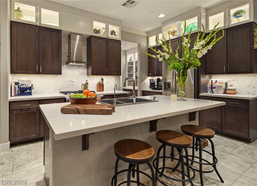 Classic styling and turnkey finishes define this well-appointed pied-Ã -terre located in Summerlin South. The interior features balanced natural light, custom crown and base moldings, & hardwood-style flooring. The kitchen features quartz countertops, custom cabinetry, stainless-steel appliances, & a custom-built-in walk-in pantry. The primary suite offers a comfortable layout with a walk-in closet & an ensuite bath with marble-style surfaces & an oversized shower. A secondary room provides flexibility for guests, work, or additional storage needs. The third bedroom is finished with custom built-ins & a desk. All closets are fully custom outfitted. Custom three-panel sliding doors lead to a lush, private patio suitable for outdoor seating, dining, or quiet relaxation. Additional features include upgraded shutters, electrical and lighting, Brizio and Delta plumbing fixtures, and custom vanities. This gated community features a clubhouse and gym with a spacious pool and cabana area.