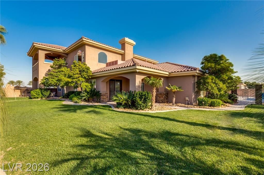 Strip views in southwest Las Vegas near the Allegiant Stadium on nearly a half acre of land! This stunning custom estate offers resort-style outdoor living and entertainers' amenities at every turn ? with no HOA. Inside, soaring ceilings and an open floor plan showcase a gourmet kitchen with island and walk-in pantry, a grand great room and a sprawling loft. The primary suite features its own fireplace, spa bath with city views from the soaking tub, and a generous walk-in closet. Hardwood and tile flooring, granite throughout, surround sound, and smart electric shades complete the refined package. Outside, a covered kitchen overlooks a rock waterfall pool and spa, putting green, and RV parking. Plenty of room for everything you need. Your own private compound awaits!
