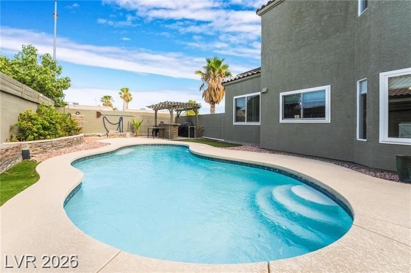 Fully renovated 4 bedrooms 3 full bathrooms pool home with no HOA and RV parking. Cathedral ceilings and stylish epoxy flooring will welcome you in! Sitting on a spacious corner lot, this beauty features brand new and upgraded bathrooms, staircase, flooring, Granite countertops & backsplash in kitchen with stainless steel appliances, energy saving windows, doors, ceiling fans in all bedrooms. Walk-in closet in Master and 2nd Bedroom. New windows throughout home. New solar heated pool and built in BBQ area with cover to enjoy the amazing Vegas weather, in the winter the fireplace will keep you warm and cozy in your family room, while you enjoy the built-in bar. New Plantation shutters in living room. Lemon trees in the backyard. Solar Power system to lower your bills. Minutes away from highways, golf course, shops and restaurants. Schedule your showing today!