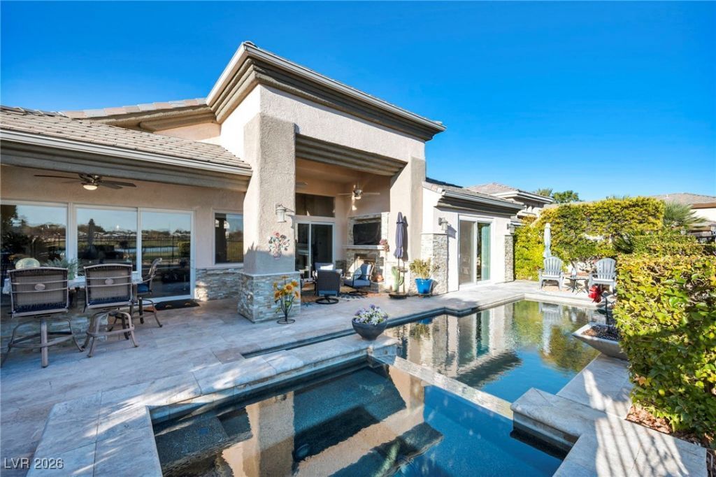 Welcome to the gated North Summerlin community of Canyon Ridge, where this single story property blends architectural elegance with stunning golf course views! Located on the 10th hole of the exclusive TPC Las Vegas, this home features an open-concept floor plan for easy entertaining. A stacked-stone fireplace in the vaulted living room serves as a strong focal point. The remodeled gourmet kitchen boasts a central island with quartz countertops, tile backsplash, breakfast nook, and stainless-steel appliances. An oversized built-in eating island with a waterfall edge provides a casual dining area. The private primary suite offers exterior access and a spa-like bathroom with dual sinks, a walk-in shower, and tile flooring. The lush exterior, with views of the golf course, lake and mountains, features a solar-heated saltwater pool, spa with waterfall, outdoor kitchen, three gas firepits, and a covered outdoor seating area.