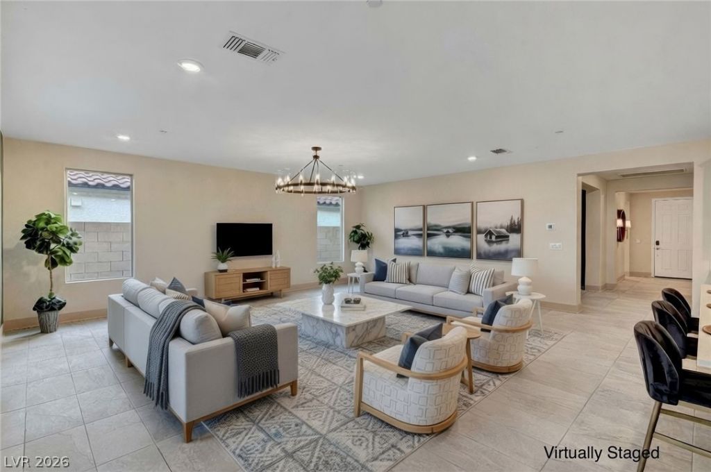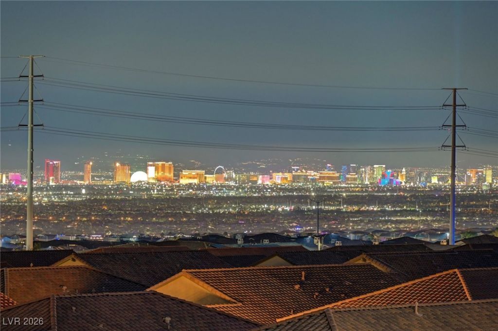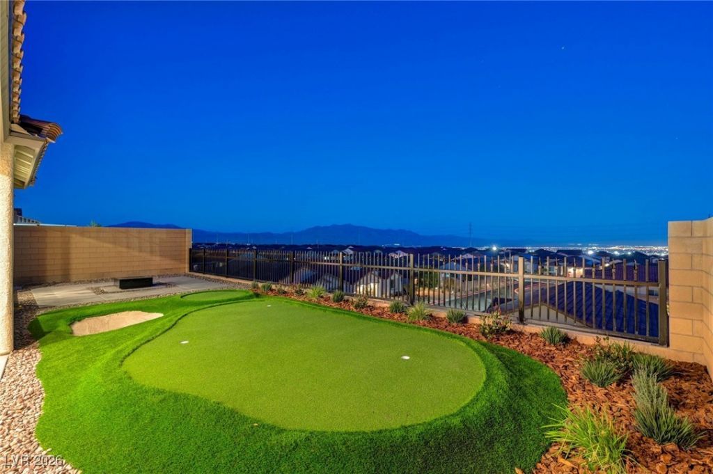Thoughtfully upgraded home set on an elevated lot, offering spectacular sunrise-to-sunset mountain, city, and Las Vegas Strip views. The primary suite is a serene retreat featuring expansive views, a spa-inspired shower, and walk-in closet. A secondary primary suite is discreetly positioned apart from the additional bedrooms, offering ideal separation and privacy.. Two additional bedrooms with a shared bath are also separated, providing exceptional privacy. New, lush carpet and pad enhance all bedrooms throughout. Designed for effortless living and entertaining, the open-concept living, kitchen, and dining spaces feature stainless steel appliances and custom light fixtures. A flex room offers versatility as a den, formal dining room, or exercise space. Outdoor living is equally impressive with an oversized covered patio, putting green, and fire pit area?ideal for enjoying the elevated views. Located within a gated community with roaming security for added peace of mind.
