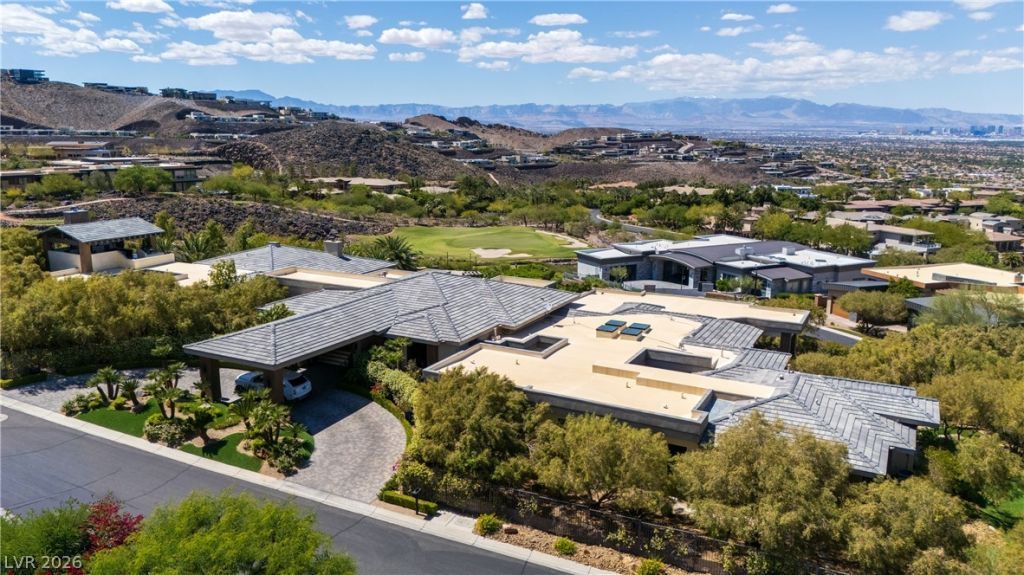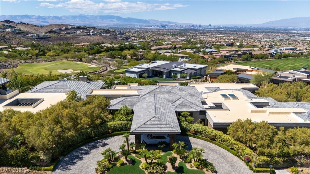 Step into a realm where luxury meets the sky. This 6-bedroom masterpiece frames unobstructed Las Vegas Strip views through floor-to-ceiling retractable glass, merging indoor elegance with an outdoor oasis. A grand staircase and sacred Tibetan stone fireplace anchor the living space, while the gourmet kitchen ? with its extended island, butler's pantry, and cocktail bar ? invites culinary artistry. Retreat to the primary suite, featuring a private coffee bar, fireside sitting area, and panoramic balcony. Outside, a resort awaits: 2 pools, 2 spas, 7 cascading waterfalls, and an outdoor kitchen. Indulge in the 12-seat theater, wellness wing with steam/sauna, gym, and wine grotto. Set within the prestigious, guard-gated MacDonald Highlands, this estate offers an exclusive lifestyle defined by privacy, security, and world-class amenities. Opportunities to own a sanctuary of this magnitude, complete with a 7-car garage and multi-gen ensuites, are exceedingly rare. A true entertainer's dream.