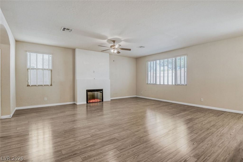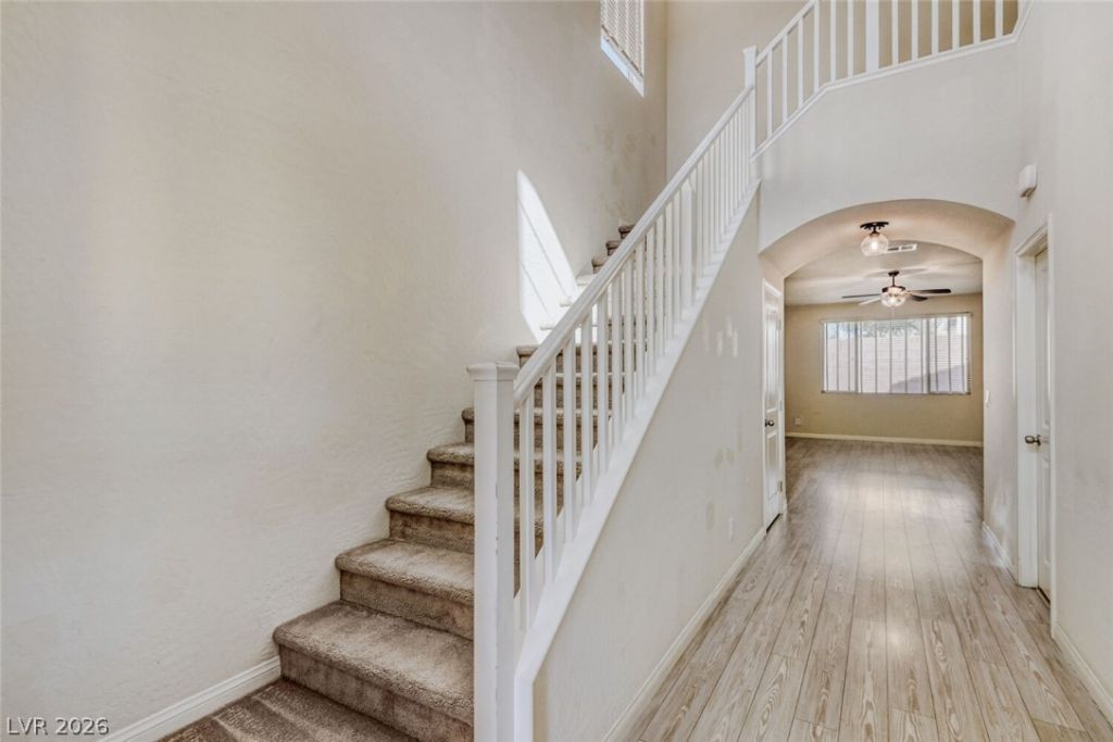 Updated Southwest two-story is conveniently located near premier shopping, dining, and entertainment. With easy access to I-215, this well-maintained home features an open floor plan with a comfortable main-living area and a gourmet kitchen that opens to the lush exterior. The space includes an oversized central island with seating, stainless steel appliances, a walk-in pantry, and casual dining. It has new cabinetry and lighting. Arched doorways and wood-grained tile flooring create a sophisticated aesthetic. The upper-level primary is a private sanctuary with a stylish bath, dual vanities, and a walk-in shower. Outside, a covered patio and heated pool are perfect for entertaining. A mature lemon tree enhances the ambiance and provides a bountiful harvest. The property also features a two-car garage with an EV car charger. The gated community offers a pool, playground, and basketball courts.