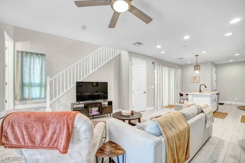 Nearly brand new, fully furnished 2-story home in the sought-after Cadence master-planned community. This 1,500 sq ft upgraded home features an open floor plan, gourmet kitchen with stainless steel appliances, quartz countertops, soft water loop, and upgraded tile flooring throughout the downstairs. Enjoy high ceilings, upgraded carpet upstairs, mission-style stair rails, and a private side patio. Community perks include access to Cadence Central Park 50 acres of amenities like a lap pool, splash pads, fitness court, amphitheater, pickleball courts, playgrounds, and weekly events. Just minutes from Lake Las Vegas (a vacation feeling environment), shopping, dining, schools, parks, and entertainment.