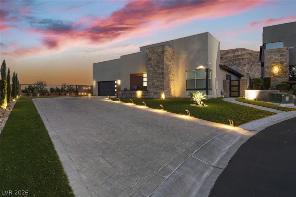 Exquisite fully remodeled single-story estate in premier gated Nova Ridge, Summerlin, on over 1/3 acre with unobstructed Las Vegas Strip & majestic mountain views. Architectural masterpiece radiating sophisticated luxury with seamless open-concept living merging family room & gourmet kitchen, perfect for entertaining. Sun-drenched spaces feature pocket doors opening to private oasis: resort-style backyard with pool & covered outdoor kitchen. 3 bedrooms with spacious custom walk-in closets offering plus den/seating area with glass doors. Chef's kitchen offers premium granite countertops, top-of-the-line stainless steel appliances & abundant custom cabinetry. The spa-inspired master suite serves as your ultimate sanctuary, featuring two custom walk-in closets and a lavish private bathroom appointed with dual vanities and an oversized rain shower. Situated in tranquil, exclusive gated enclave steps from walking trails & parks, the perfect blend of refined elegance & serene accessibility.